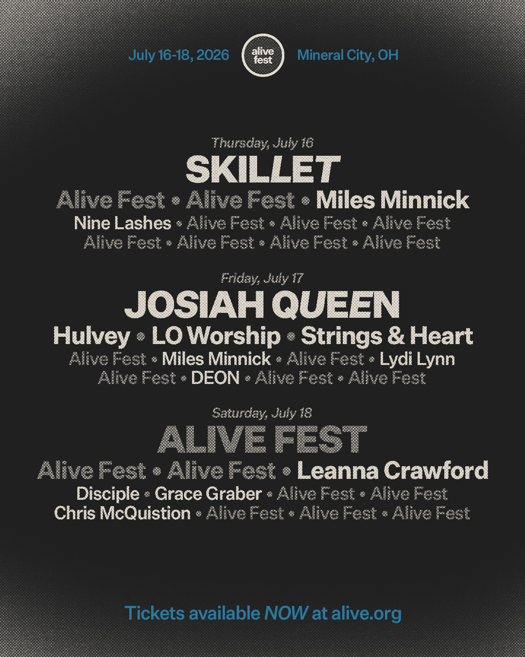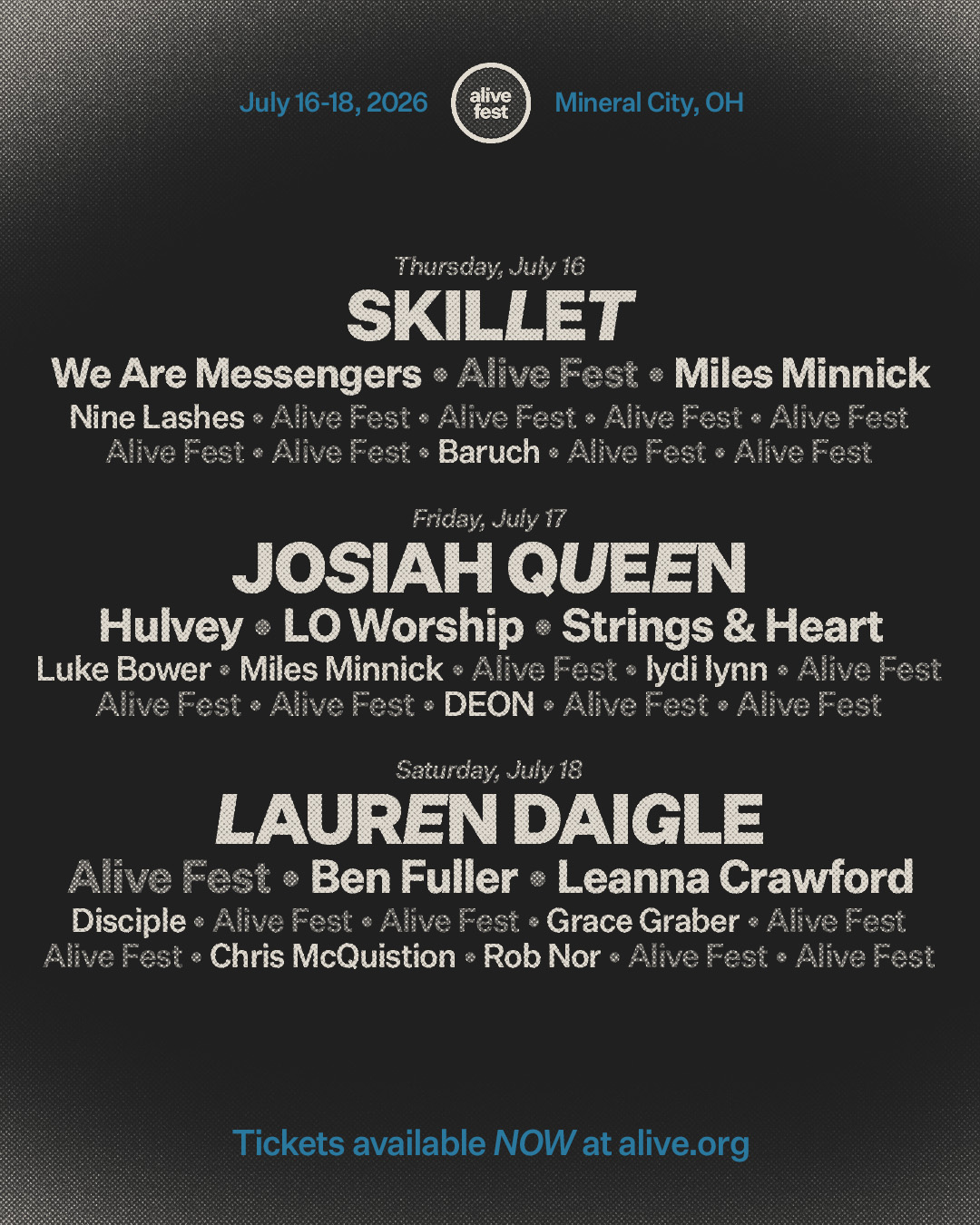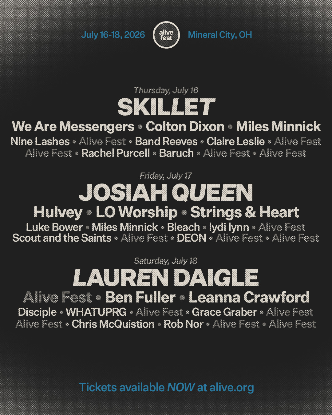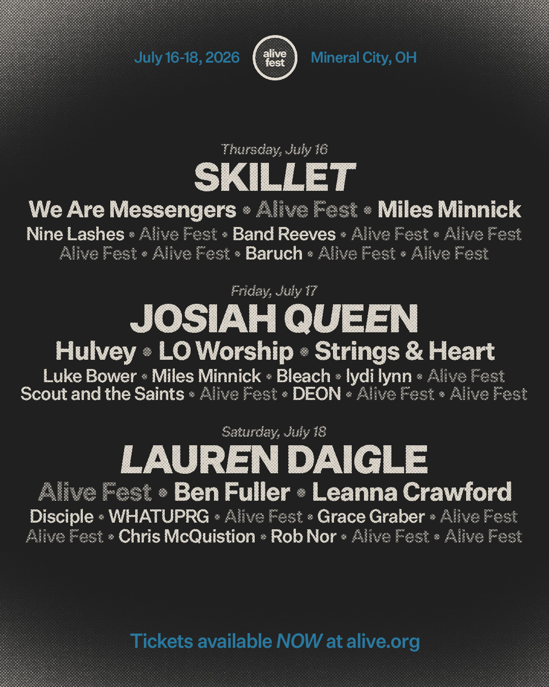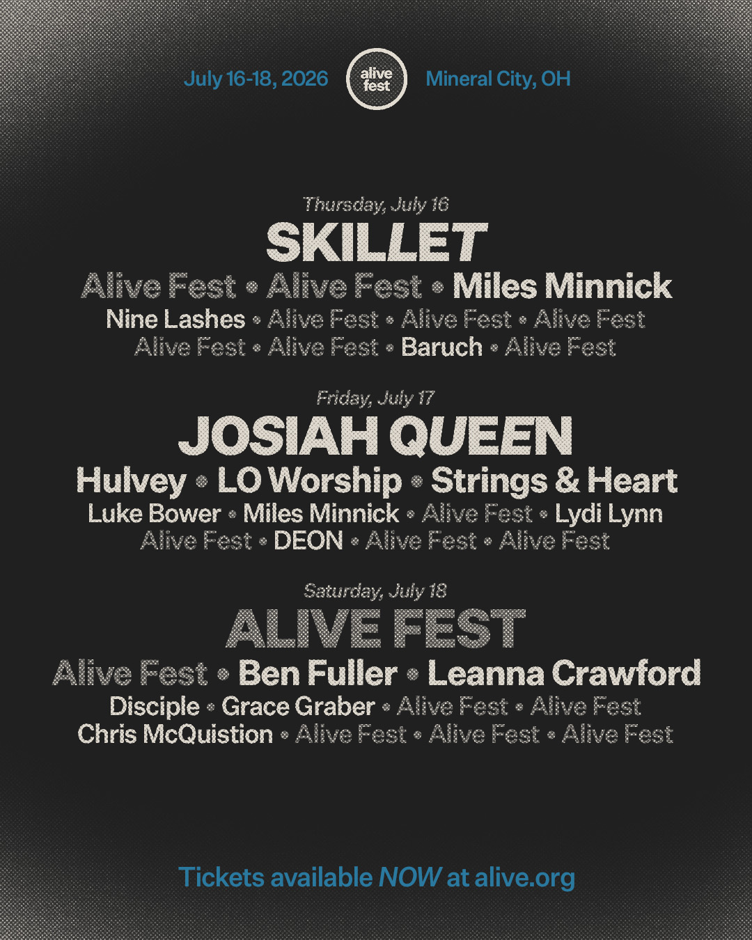 Alive is a 3-day music festival with multiple stages, 40+ artists, beautiful camping + RV sites, a 1,500-acre lake, tasty food and drinks, VIP experiences, late night comedy, and so much more. Alive takes place July 16-18, 2026 at Atwood Lake Park in Mineral City, OH.