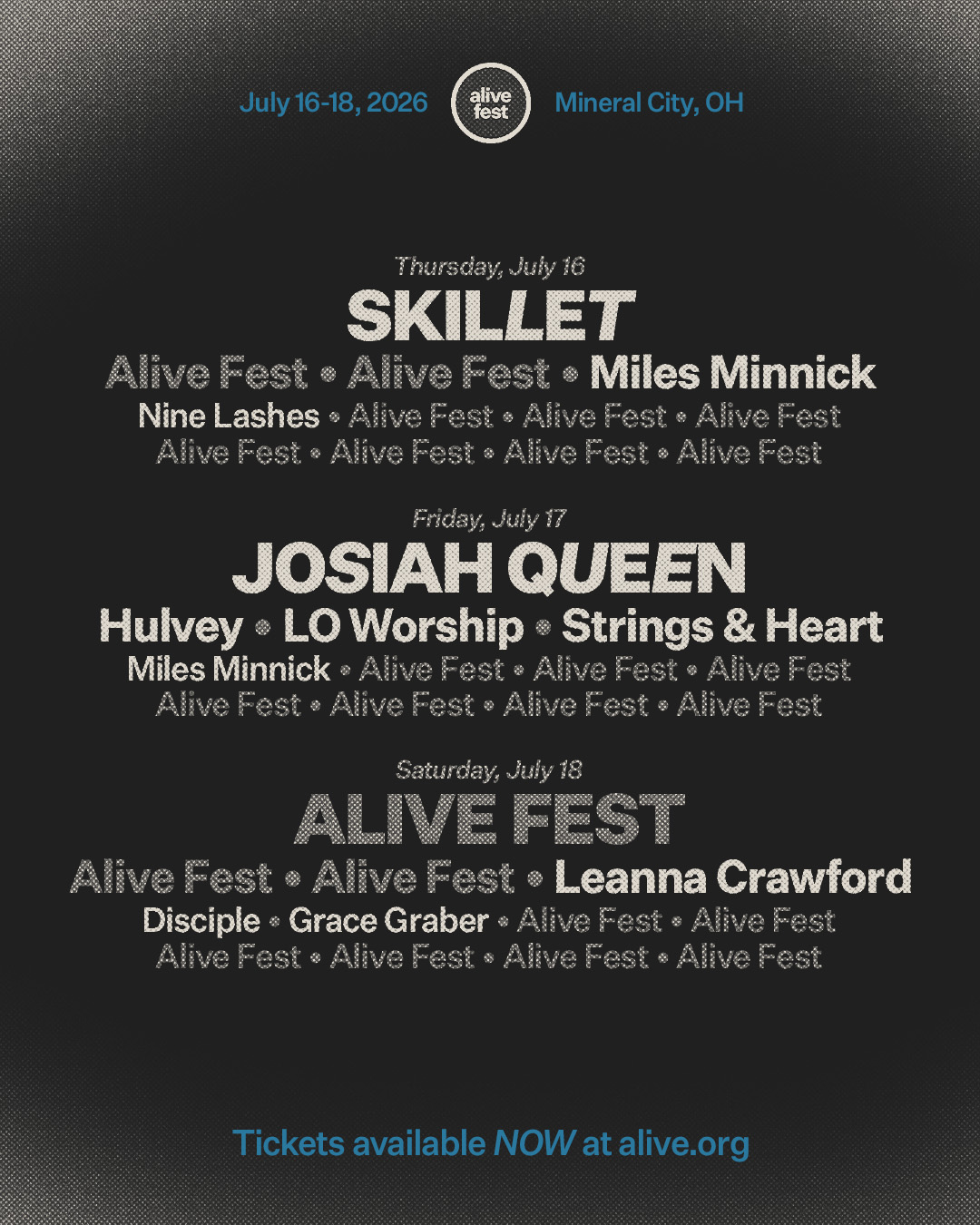 Alive is a 3-day music festival with multiple stages, 40+ artists, beautiful camping + RV sites, a 1,500-acre lake, tasty food and drinks, VIP experiences, late night comedy, and so much more. Alive takes place July 16-18, 2026 at Atwood Lake Park in Mineral City, OH.